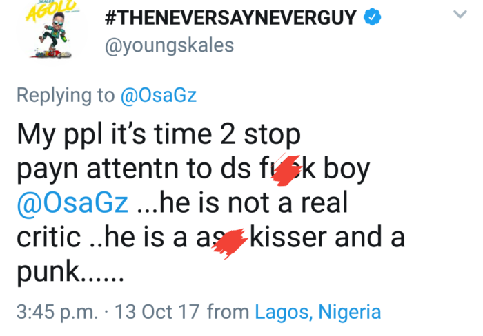 My ppl it’s time 2 stop paying attention to ds f**k boy @OsaGz …he is not a real critic ..he is a ass kisser and a punk……