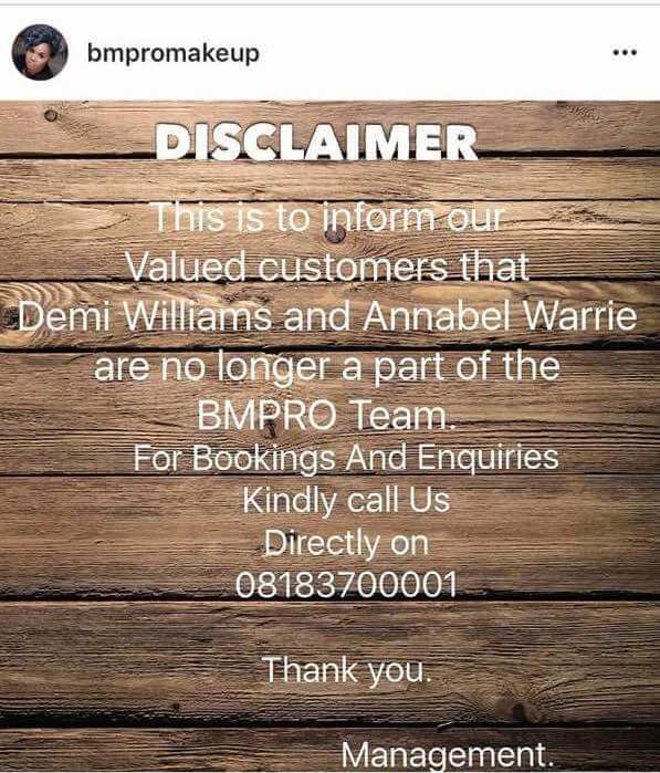 Few months ago celebrity makeup artist, Banke Meshida Lawal of BM|Pro‘s leading employees, Demi William and Annabel Warrie resigned to start their own businesses.