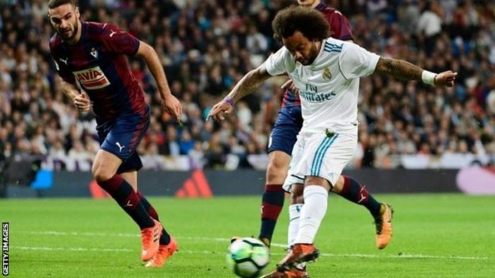 Marcelo scored a late third after turning a defender to smash home following a one-two with Karim Benzema.