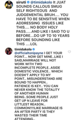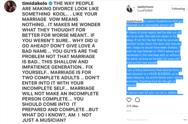 Celebrities like Uti Nwachukwu, Daddy Freeze and Toni Payne have all disagreed with Timi Dakolo on his nugget on marriage and divorce.