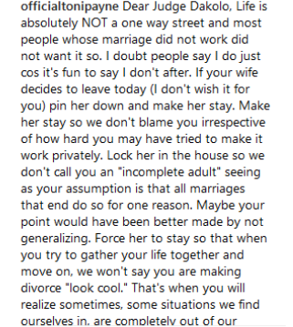 “The way people are making divorce look like something kool.. . Like your marriage vow means nothing.. It makes me wonder what they thought for better for worse meant.. If you weren’t sure.. Why did u go ahead? Don’t give love a bad name .. You guys are the problem not that marriage is bad.. This shallow and impatience generation.. Fix yourself.. Marriage is for two complete adults .. Don’t enter into it with your incomplete self… marriage will not make an incomplete person complete… you should come into it prepared and complete ..But what do i know?, am i not just a musician?”