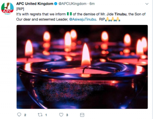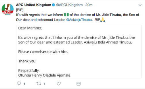 The APC in London also confirmed the news of Jide Tinubu’s death.