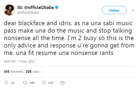 ‘dear blackface and idris. as na una sabi music pass make una do the music and stop talking nonsense all the time. I’m 2 busy so this is the only advice and response u’re gonna get from me. una fit resume una nonsense rants’.