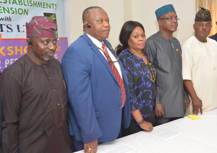 L-R: Chairman, XLS Concept, Mr. Akeem Apatira; Director of Account, Office of Establishment and Training, Mr. Deji Koko; Permanent Secretary, Ministry of Establishments, Training and Pensions, Mrs. Clara Ibirogba; Commissioner for Establishments, Training and Pensions, Dr. Benson Oke and the Chairman, House Committee on Establishments and Training, Mr. Adebayo Famakinwa, during a 2-day workshop on higher performance held in Ikeja, Lagos.