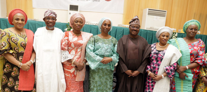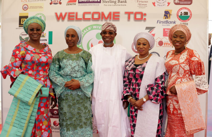 Wife of the Vice President of Federal Republic of Nigeria, Mrs. Dolapo Osinbajo (m); wife of the governor of Lagos State, Mrs. Bolanle Ambode (3rd left); Governor of State of Osun, Ogbeni Rauf Aregbesola (2nd left); & his wife, Sherifat (2nd right); Governor of Oyo State, Sen. Abiola Ajimobi (3rd right) & his wife, Florence (L); and wife of the governor of Ekiti State, Mrs. Feyinsetan Fayose (r), during the opening ceremony of National Women conference, with the theme; “Virtuous Woman – Pushing for Greater Development”, organised by Osun Officials’ Wives Association (OSUNOWA), on Tuesday, 27th February, 2018, at Oshogbo, Osun State.