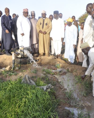 From Left: Minister of Information and Culture, Alhaji Lai Mohammed; Kebbi State Commissioner for Agriculture, Mr. Garba Mohammed; Kebbi State Commissioner for Information and Culture, Alhaji Musa Hassan Kalgo and some rice farmers during the inspection of a water-sourcing facility at a rice farm in Jega, Kebbi State, on Sunday.