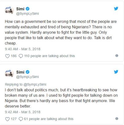 Singing sensation Simi posted a message on social media stating that she used to fight people who say bad things about her country, but now there’s really nothing to fight for anymore.