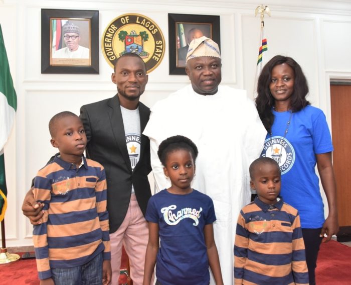 Lagos State Governor, Mr. Akinwunmi Ambode (middle); new World Record Holder in Longest Reading Marathon, Mr. Bayode Treasures-Olawunmi (left); his wife, Tosin and children, Master Jedidiah; Miss Hephzibah and Master Jephthah during his visit to the Governor at the Lagos House, Alausa, Ikeja, on Wednesday.
