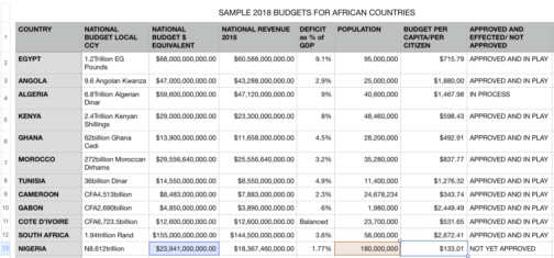 Table 1: 2018 Budgets for some African countries. Note; sources include Reuters, country’s Ministry of Finance websites, sundry Internet sources. I have used a uniform source for USD exchange rates (market rates), since ‘official rates’ are not obtainable in some instances. Hence, Nigeria’s N8.6 trillion was converted at N360=$1. Also, I have emphasised the revenue aspect of the budget (most countries plan budget deficits), so as to show that many ‘smaller’ countries have the capacity and capability to raise more national revenue than Nigeria – the ‘largest’ economy in Africa.