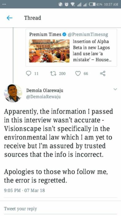 He said: “Apparently, the information I passed in this interview wasn’t accurate. Visionscape isn’t specifically in the environmental law which I am yet to receive but I’m assured by trusted sources that the information is incorrect.