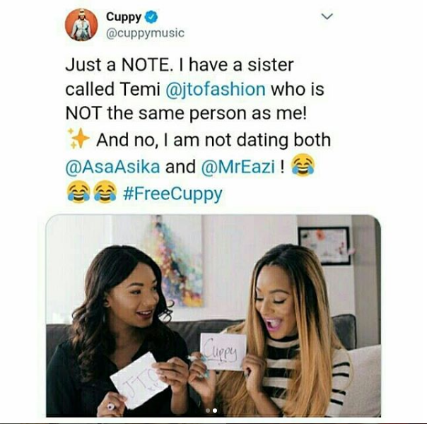Just a NOTE. I have a sister called Temi @jtofashion who is NOT the same person as me! ✨ And no, I am not dating both AsaAsika and MrEazi ! 😂😂😂 #FreeCuppy”