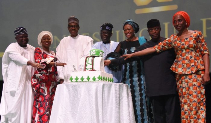 President Muhammadu Buhari (3rd left); Vice President, Prof. Yemi Osinbajo (2nd left); his wife, Dolapo (left); Celebrant, Asiwaju Bola Tinubu (middle); his wife, Senator Oluremi (3rd right); Lagos State Governor, Mr. Akinwunmi Ambode (2nd right) and his wife, Bolanle (right) during the 10th Asiwaju Bola Tinubu Colloquium at the Eko hotel & Suites, Victoria island, Lagos, on Thursday.