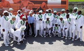 The players, in their flashy traditional attire that has captured the world’s attention, were given a spectacular welcome at their base with music and dance.