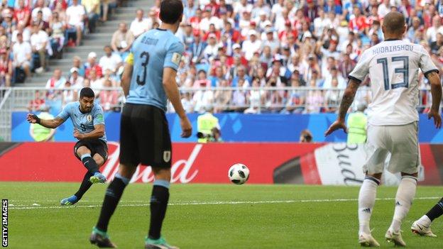 Russia had scored eight goals in sweeping victories over Saudi Arabia and Egypt and were already guaranteed to progress, but they went behind in their final group match after only 10 minutes when Luis Suarez drilled in a clever low free-kick.