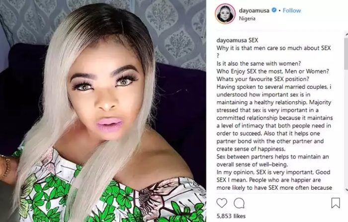 Nollywood actress Dayo Amusa has made a post on social media stating that sex in a relationship is very important, as this helps the couple to bond.