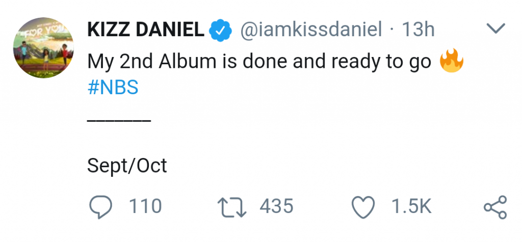 Fly Boi Inc boss, Kizz Daniel has given a hint on Twitter that he will be releasing his 2nd album later in the year and this is good news to the ”Yeba” crooner fans.