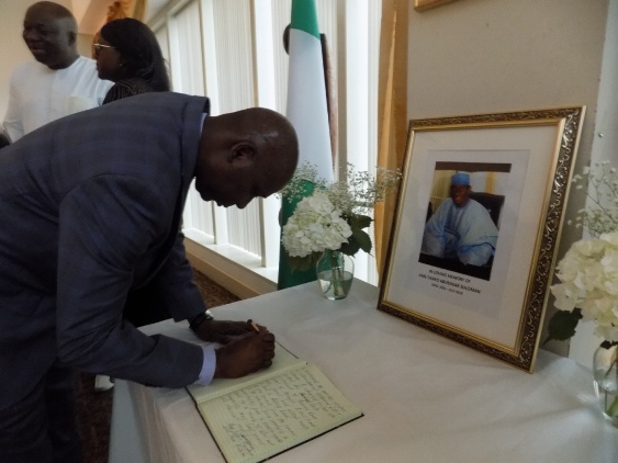 NIGERIA’S AMBASSADOR TO THE UN, PROF TIJJANI MUHAMMAD-BANDE, SIGNING THE CONDOLENCE REGISTER OPENED FOR LATE AMB. TANKO SULEIMAN AFTER A “FIDDAU” PRAYER SESSION AS PART OF THE 3 DAYS’ FIDDAU AT THE NIGERIA HOUSE IN NEW YORK.