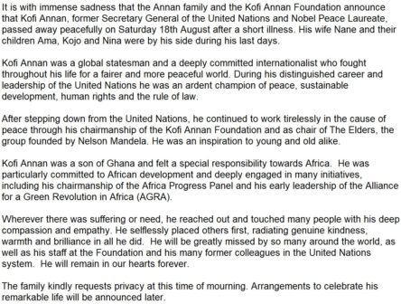 It is with immense sadness that the Annan family and the Kofi Annan Foundation announce that Kofi Annan, former Secretary General of the United Nations and Nobel Peace Laureate, passed away peacefully on Saturday 18th August after a short illness…