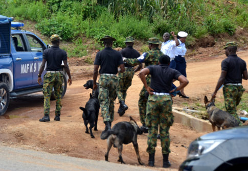 Some Air Force personnel cordon the road leading to where an Air Force Fighter Jet crashed on Katampe hill in Abuja on Friday (28/9/18). One person feared dead. Hogan Bassey/BJO/NAN