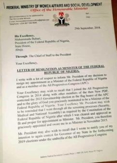 Read her letter to President Buhari and also her letter to the APC. We must warn that her letter to the president starts with a typo: ‘resignition’ instead of resignation: