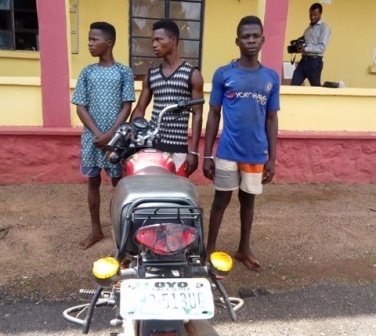 The suspects which include,Tobi Kodaolu, 20, who is the main culprit; Kehinde Kodaolu, 16 and Ahmed Babalola, 18, were said to have killed one Oni Oluwajuwon because of his Bajaj motorcycle with the registration number Oyo, GMO 513UG in Kila village area of Odeda Local Government.