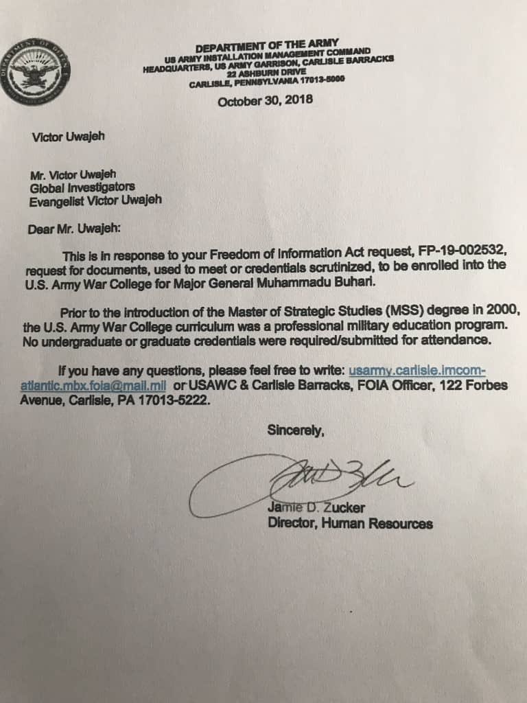 This letter from the US War College completely puts to lie any claims by the @MBuhari campaign that Buhari submitted his WAEC certificate to the @ArmyWarCollege. They have denied him. No matter how far falsehood has traveled, it must be overtaken by truth #RenosDarts pic.twitter.com/M8magFVCgG