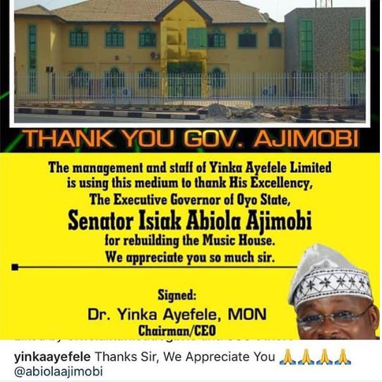 Musician, Yinka Ayefele has taken to social media to thank the Executive Governor of Oyo State, Abiola Ajimobi for rebuilding the demolished Music House, Ibadan.