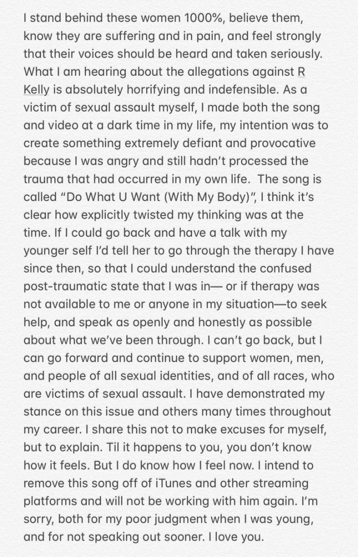 U.s. singer lady Gaga has apologised for collaborating with R. Kelly on her song ”Do What You Want With My Body” stating that she was in a dark time in her life after being sexually assaulted at 19 and going forward will be removing the song from iTunes and other streaming platforms.