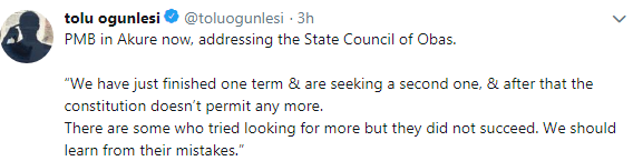 Buhari, who was addressing the State Council of Obas in Akure, Ondo State during his re-election campaign he had just finished one term and seeking a second term, after which the constitution bared him from contesting.