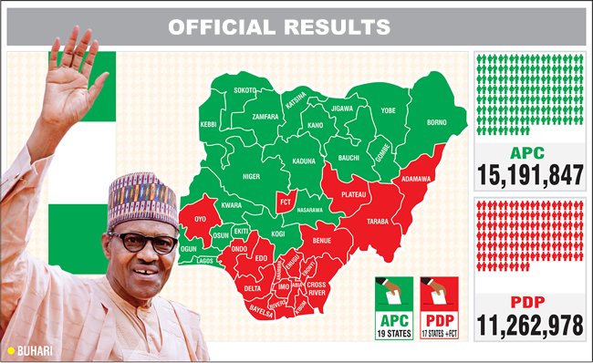 Buhari won in Ekiti, Osun, Kwara, Nasarawa, Kogi, Gombe, Yobe, Jigawa, Niger, Kaduna, Bauchi, Lagos, Ogun, Kano, Katsina, Borno, Sokoto, Kebbi and Zamfara.