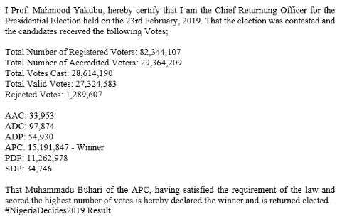 INEC Chairman, Mahmood Yakubu, who declared the results around 4:39am said Buhari polled 15,191,847 votes to defeat his rival, Atiku Abubakar of the Peoples Democratic Party, PDP, who polled 11,262,978 votes.