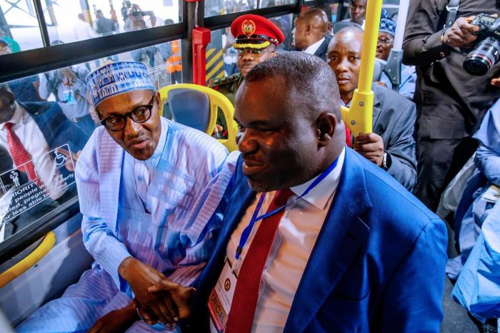Caption: President Buhari with Biodun Otunola, the CEO of Planet Projects, which conceived and built the Oshodi Transportation Interchange, commissioned on Wednesday in Lagos. In the middle is Gov. Ambode