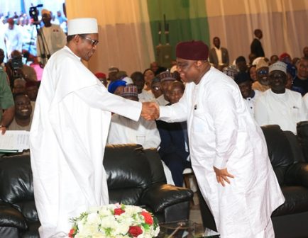 President Muhammadu Buhari in a handshake with the Publisher of Leadership Newspaper, Mr. Sam Nda-Isaia during the honours award to the President by Progressive Governors Forum held at the Presidential Banquet State House Abuja. PHOTO; SUNDAY AGHAEZE. MAY 10 2019