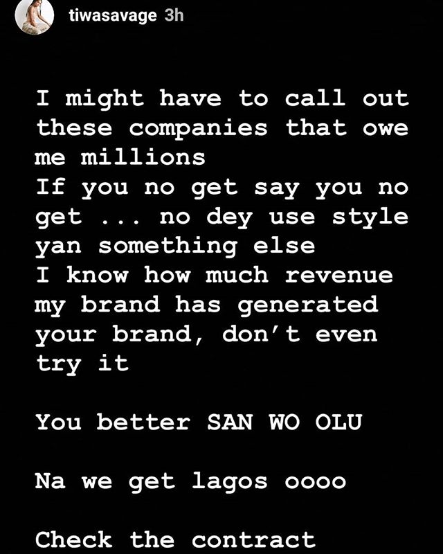 We do not know who these firms are but obviously, the singer ain’t here to joke at all. In her post she wrote: ”I might have to call out these companies that owe me millions. If you no get say you no get … no dey use style yan something else. I know how much revenue my brand has generated your brand, don’t even try it. You better San wo olu. na we get Lagos ooo check the contract”.