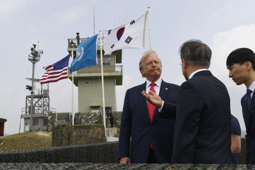 Peering into North Korea from atop Observation Post Ouellette, Trump told reporters that there has been “tremendous” improvement since his first meeting with the North’s leader in Singapore last year.
