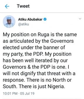 “My position on Ruga is the same as articulated by the Governors elected under the banner of my party, the PDP. My position has been well iterated by our Governors & the PDP is one”, he tweeted.
