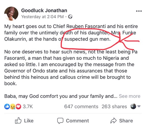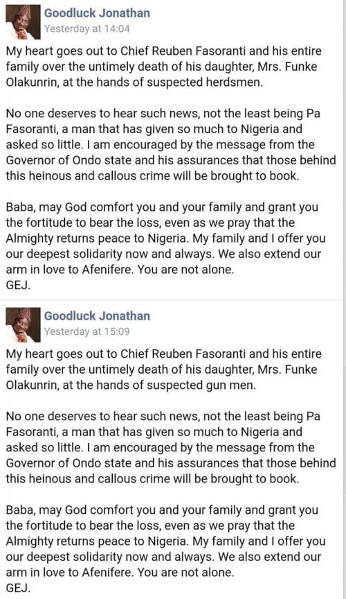 Former President Goodluck Jonathan found himself Sunday embarrassed by his being discovered to have edited his initial posts on Facebook and Twitter, following the killing of Funke Olakunrin, daughter of Pa Reuben Fasoranti, the leader of one of the Afenifere factions.
