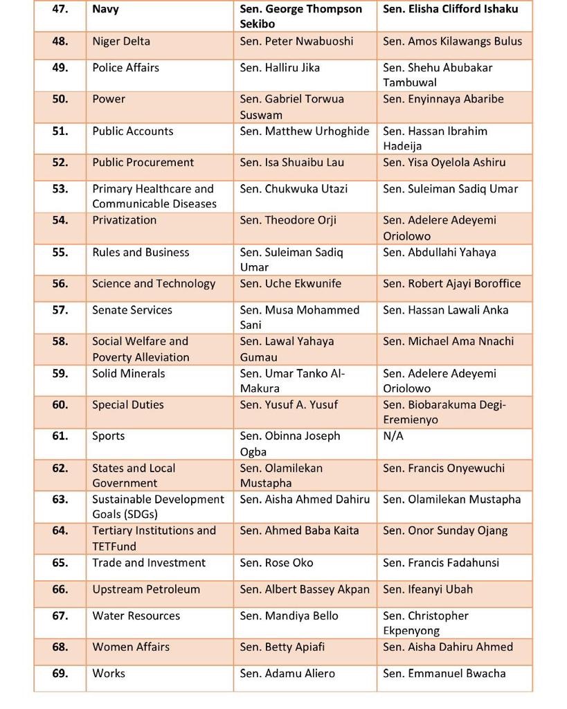 Here is the list of the chairmen and deputy chairmen of the 69 committees announced by Senate President Ahmed Lawan.