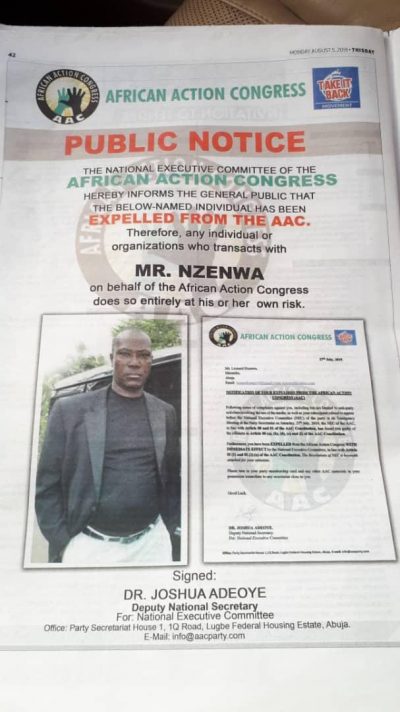 “The African Action Congress therefore issues a call to the police and security agencies for the arrest of Mr. Leonard Nzenwa and his criminal actors, and calls on the general public to dissociate themselves with any actions of this expunged delinquent”..
