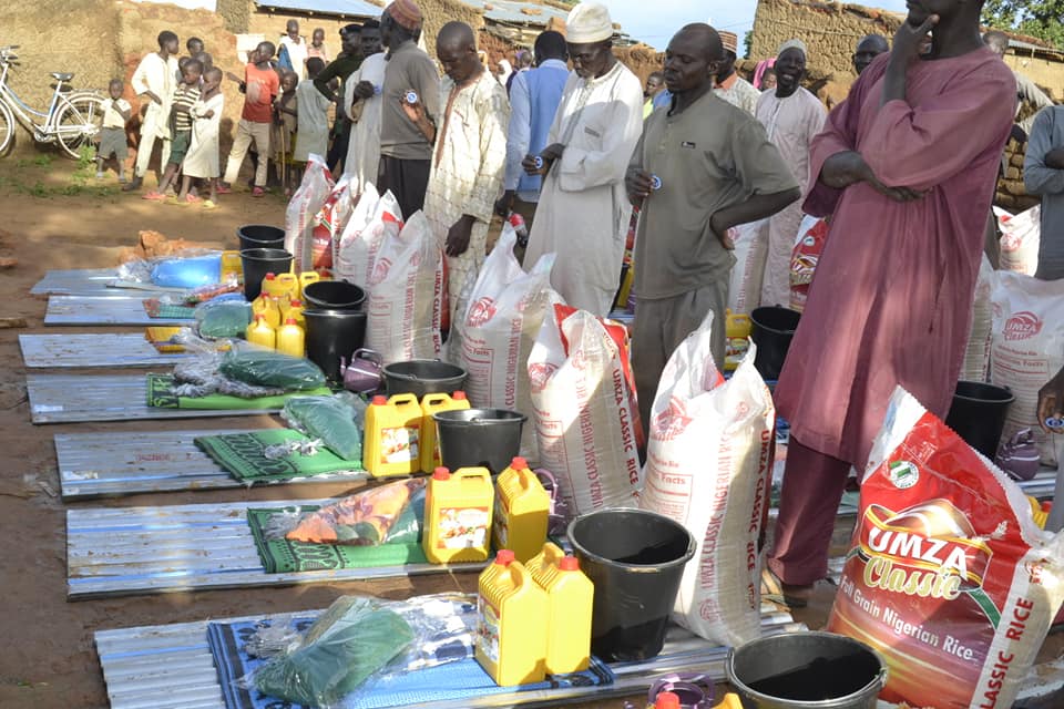 The items distributed include 50Kg bag of Rice, vegetable oil, Bundles of Roofing Zinc, Blankets, Mat and kettle, 30 Pieces of 2/3,2/4,2/2 Wood, Nails and kettles.
