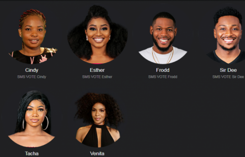 As the Big Bother Naija hots up, six housemates, Cindy, Esther, Frodd, Sir Dee, Tacha and Venita are up for eviction from the show.