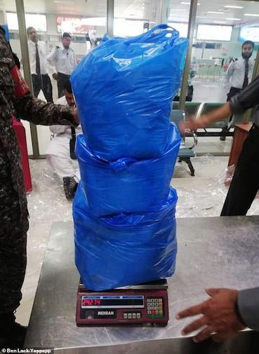 Officials removed the bags containing the drugs and placed them into a blue carrier bag for weighing. It returned a weight of 25kg.