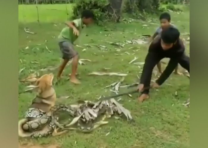 Amazing video of three boys saving a dog from boa constrictor