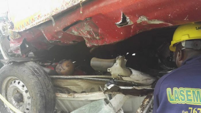 He said a yet-to-be identified male adult male driver of the crushed Toyota Hilux lost his life, while a woman trapped in the hilux, by the name, Toyin was rescued.