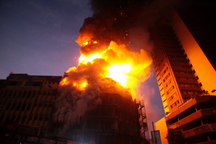 Lagos firemen were still battling to put out the fire at a six-storey building on Lagos Island, one of the two buildings gutted earlier today.