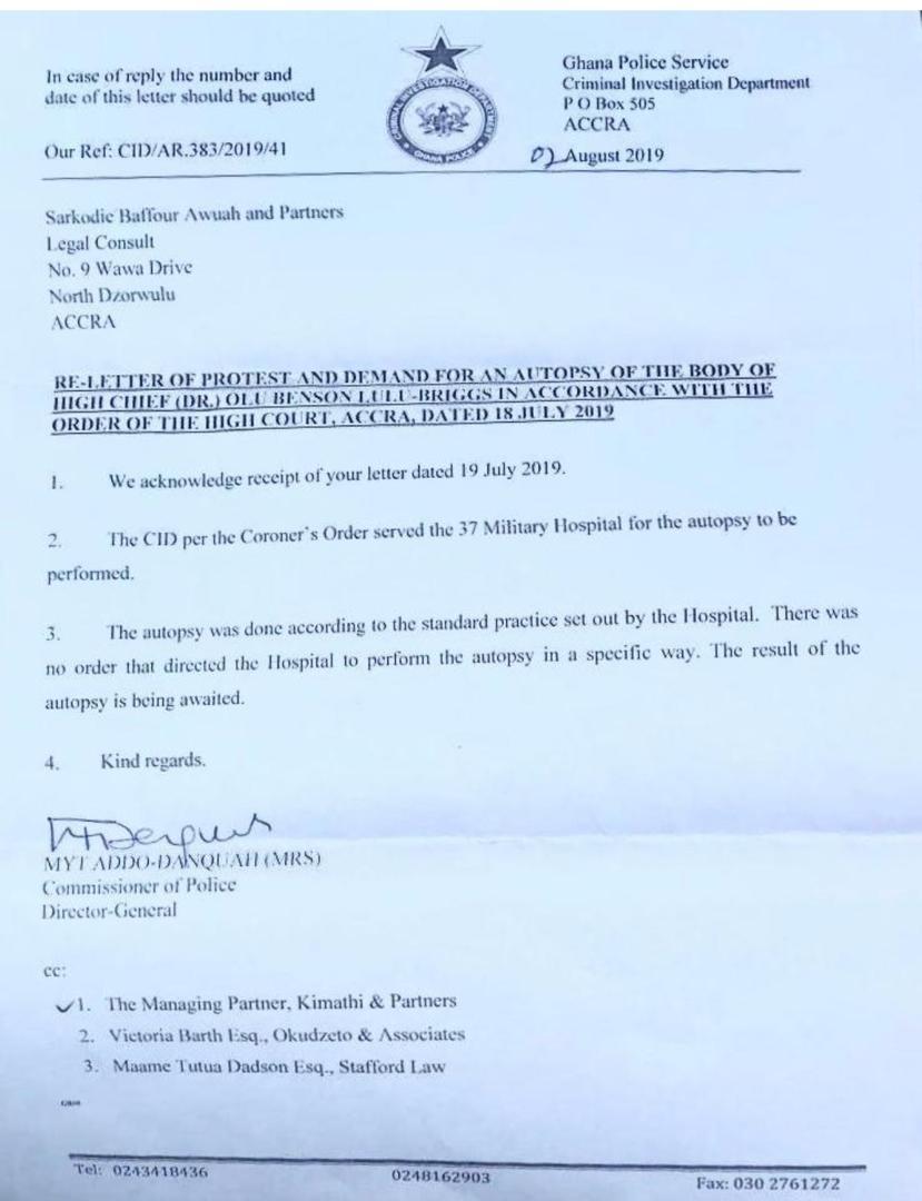 “Further, she states categorically that upon compliance with the three preconditions of the Ghanaian High Court order by Dumo and the release of the autopsy report, the 25th of January burial date as announced by Dumo and the Chiefs of Briggs compound is still very achievable. She says she wants her husband buried and that he should be buried on the 25th of January, 2020.”
