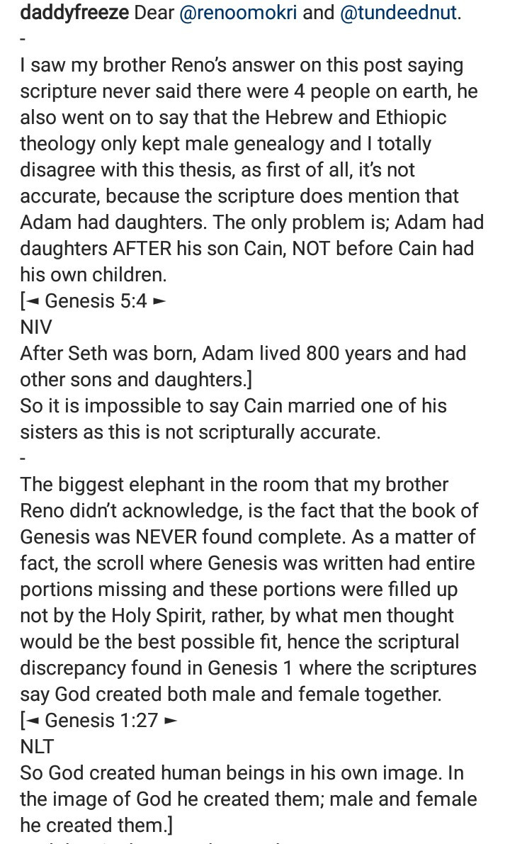 Daddy Freeze who did not agree with Reno took to his Instagram account to poke holes in Reno’s answer, saying Adam had daughters after Cain already had his own children so Cain couldn’t have married his sister.
