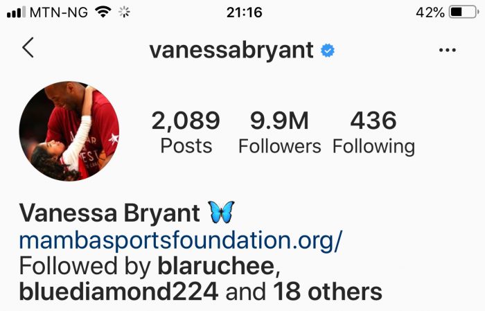 But as at Sunday 2 February, the same verified account https://www.instagram.com/vanessabryant/?hl=en has 9.9million followers.And the number keeps rising.