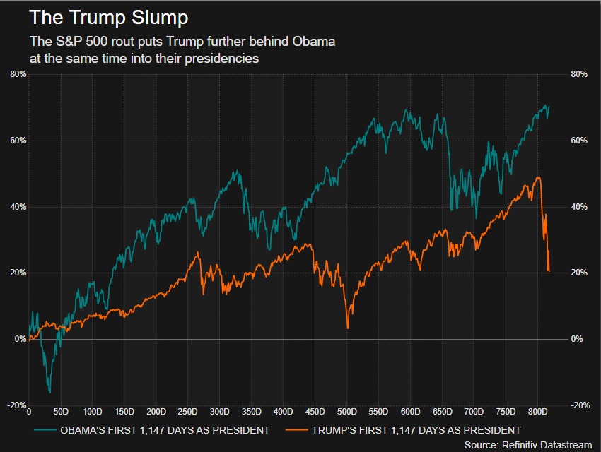 Measuring from Trump’s inauguration on Jan 20, 2017, the S&P 500 is now up less than 10%, compared to a gain of 70% under Obama during the same span of his first term.