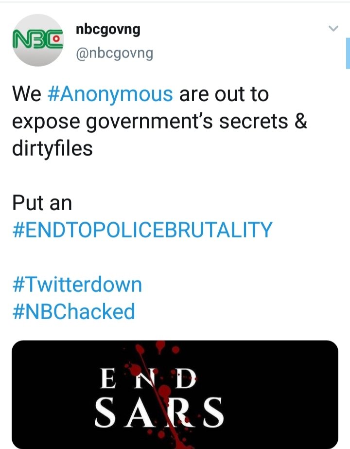 “We #Anonymous have taken over all the NG Official Twitter’s Account to support #ENDPOLICEBRUTALITY.WE’RE TOGETHER WITH NIGERIANS.EXPECT UNEXPECTED”.